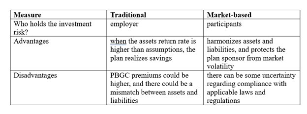 The traditional plan provides interest credits connected to 30-year Treasury yields, while the market-based plan is invested in a 2030 target date fund portfolio.
